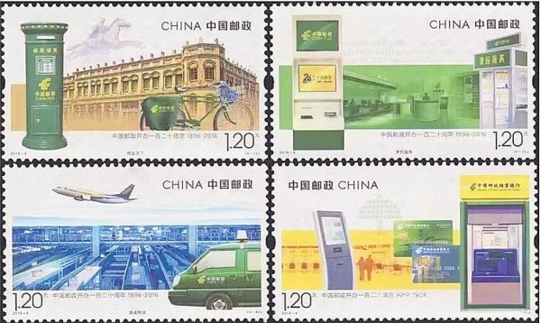 2016年3月20日,中國郵政發行《中國郵政開辦一百二十周年》紀念郵票1套4枚(圖4),展現了中國郵政的悠久歷史及現代化發展。第1枚郵票“信達天下”選用清代郵政天津局舊址、古代驛使雕塑、郵政自行車、郵筒等元素,展現了中國郵政120年的歷史畫卷,傳遞了中國郵政“信達天下”的歷史使命。第2枚郵票“便民服務”選用郵政服務大廳、便民服務站、易郵柜等元素,表現了中國郵政努力踐行“便民服務”的理念。第3枚郵票“速遞物流”選用現代化速遞物流集散中心、郵運汽車、飛機等元素,凸顯中國郵政速遞物流方便快捷、安全可靠的優勢。第4枚郵票“普惠金融”選用郵政儲蓄銀行營業廳、ATM機、郵政銀行卡(借記卡和信用卡)、中郵保險形象等元素,傳達“進步與您同步”的服務理念,凸顯“普惠金融”的行業使命。為配合相關紀念活動,中國郵政還利用當年發行的《年年有余》和《喜臨門》賀年專用郵票,印制《中國郵政開辦一百二十周年紀念》小全張1枚(圖5)。