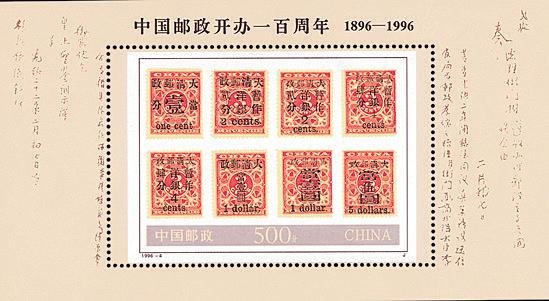 1996年3月20日,中國郵政發行《中國郵政開辦一百周年》紀念郵票1套4枚、小型張1枚。4枚郵票(圖1)選用清代天津郵政津局舊址、北京郵務管理局舊址、中華蘇維埃共和國郵政總局舊址、北京郵政樞紐4座不同時期的郵政建筑為主圖,回顧了百年郵政的滄桑,烘托了主題。4座郵政建筑風格迥異,既有民居樣式,又有現代化建筑,為了在形式上進行統一,設計者根據建筑外觀的特點,在橫形票幅的基礎上,上下各加一條灰邊,圖案上方的灰邊上印有郵票圖名和徽記,下方的灰邊擺放國銘、面值、郵票志號等。郵票畫面視角開闊,猶如一幅完整的建筑畫長卷,體現了韻律美。每枚郵票右上角的郵電徽志與左下角的綠色面值相呼應,強調了郵資憑證的屬性。小型張(圖2)郵票以分兩行排列的全套8枚清紅印花加蓋郵票為主圖,邊飾則展示了1896年3月20日清總理衙門議辦郵政折及光緒皇帝的“依議欽此”御批。紅印花加蓋郵票是清代國家郵政開辦后發行的第一套郵票,也是世界珍郵,用它作為小型張郵票主圖,不僅點明了中國郵政開辦百年的紀念主題,也展示了中國珍郵的風采。