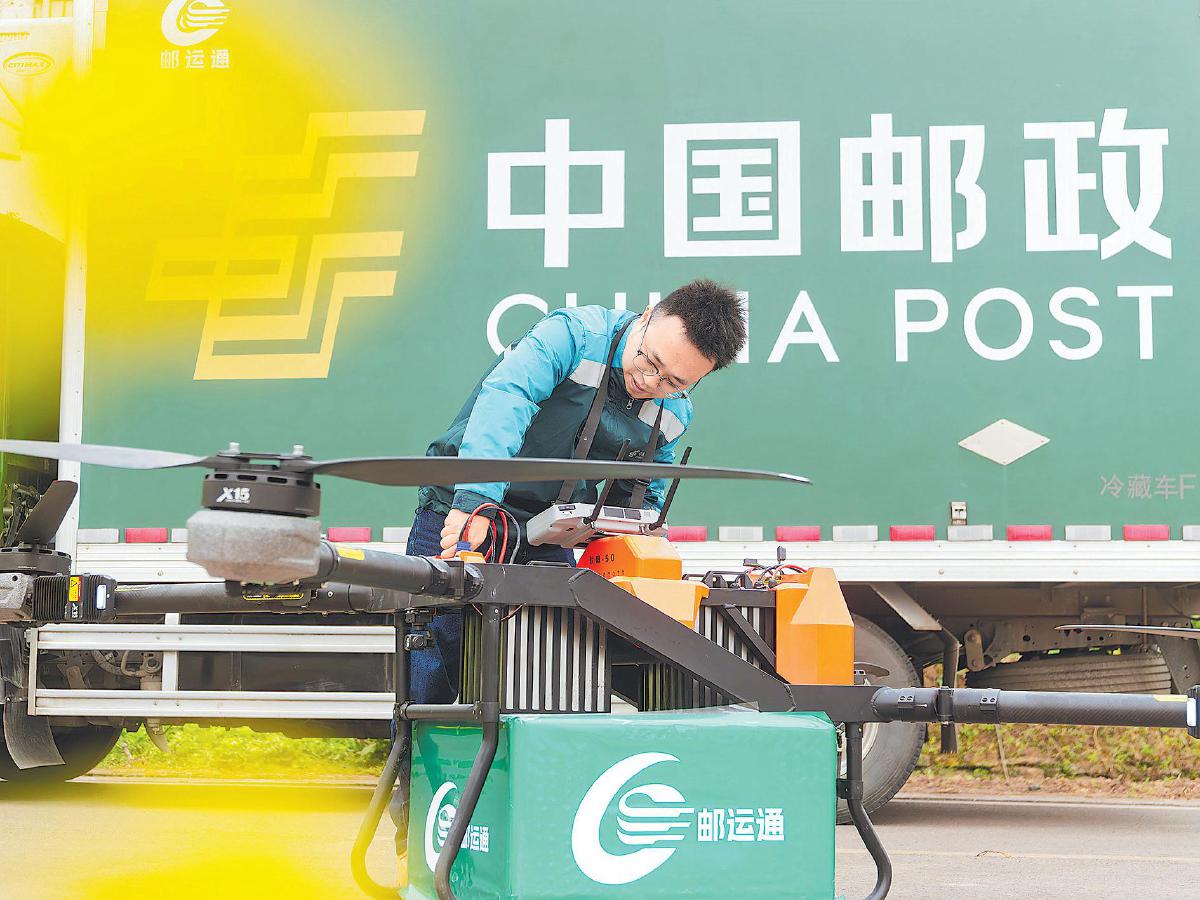 3月13日,重慶郵政飛控員在檢查無(wú)人機(jī),保障農(nóng)資精準(zhǔn)送達(dá)田間地頭。 □王金莊 攝