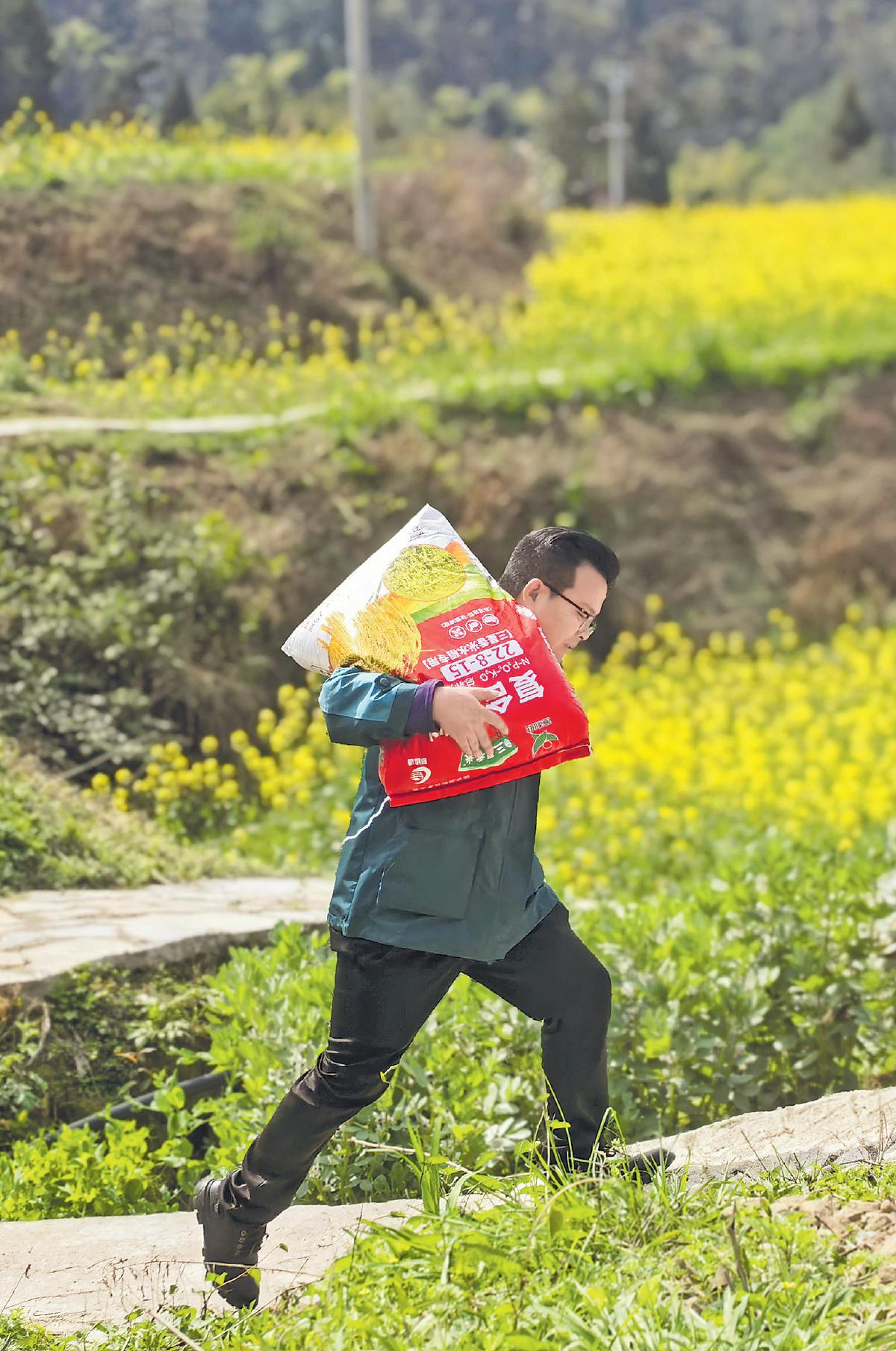 3月11日,郵政投遞員奔走在田埂間,搶農(nóng)時(shí)、保春耕,將農(nóng)資及時(shí)送到農(nóng)戶手中。 □魏馨 攝