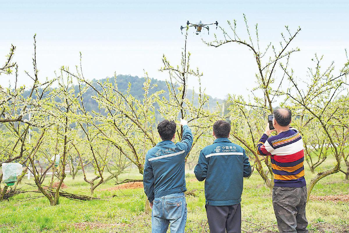 3月12日,江津區(qū)郵政分公司工作人員在柰李基地開(kāi)展無(wú)人機(jī)植保作業(yè),助力果樹(shù)增產(chǎn)。 □王春蘭 攝